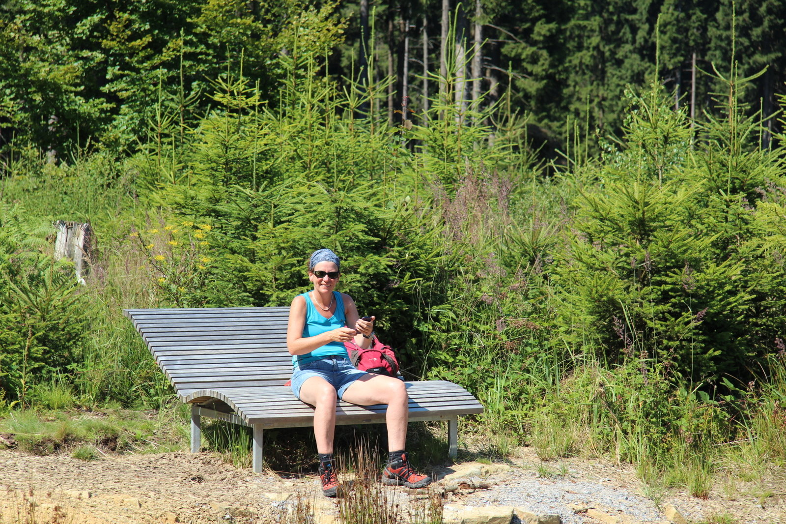 Dort lässt es sich selbst bei Hitze flott an dem idyllischen Stadtwasser entlang gehen. Der Weg hinauf aufs Mörth bremst das Tempo, denn diese Steigung hat es in sich. 30 Minuten stramm bergauf marschieren wir auf den mit knapp 450 Metern höchsten Punkt der Wanderung: „Das letzte Stück nennen Radler und Läufer auch Wadenknapp", witzelt mein Mann, während ich nach Wasser lechze. Belohnt werden wir mit einer Rast auf den Relaxliegen am „Höpperteich" - das Stillgewässer wurde auf einer vom „Kyrill"-Sturm zerstörten Fläche von Landesverband und Kreis Lippe sowie der Biologischen Station angelegt. Libellen schwirren durch die Luft, die Kammolche, die uns die Infotafel verspricht, lassen sich jedoch heute nicht blicken.