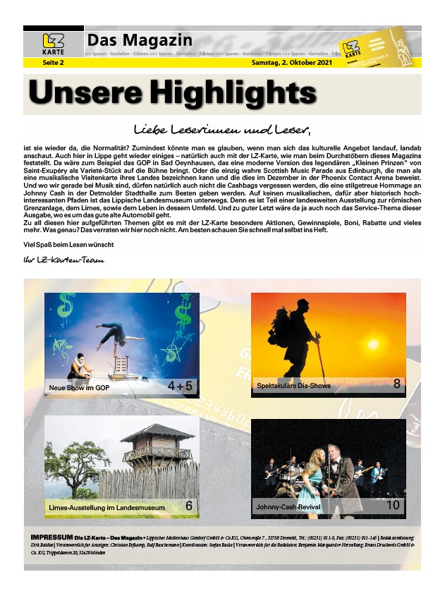 IMPRESSUM Die LZ-Karte – Das Magazin • Lippisches Medienhaus Giesdorf GmbH & Co.KG, Ohmstraße 7 , 32758 Detmold, Tel.: (05231) 911-0, Fax: (05231) 911-145 | Redaktionsleitung: