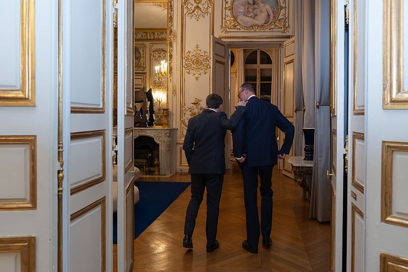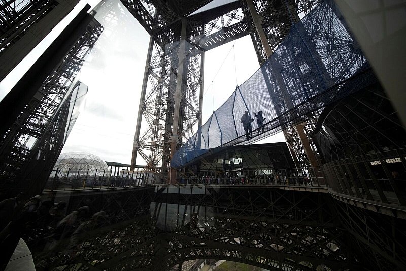 Bilder des Tages veröffentlicht am 27.02.2025 um 20:36 Uhr Schwindelerregend hoch: Besucher überqueren eine 40 Meter lange Brücke in rund 60 Metern Höhe, die mit Netzen ausgestattet ist und bis zum 9. März im ersten Stock des Eiffelturms aufgebaut ist. (© Christophe Ena/AP/dpa)
