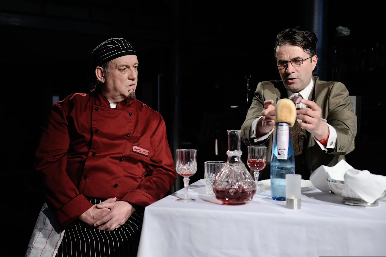 Dem „reichen Pöbel, der von einer Futterluke zur nächsten jettet, und doch nur geistlosen Fraß erhält“ stehen Köche gegenüber, die den exzentrischen Geschmack ihrer Gäste mit absurden und völlig überteuerten Kreationen bedienen. Während der Kritiker (arrogant und versnobt: Stephan Clemens) sich niederlässt, tischt der Koch seine Köstlichkeiten auf: Kutteln mit einem Wachtel-Spiegelei als Garnitur, marinierter Laich vom namibischen Ochsenfrosch und ein Quartett vom Clownsfisch an Muränenmousse.