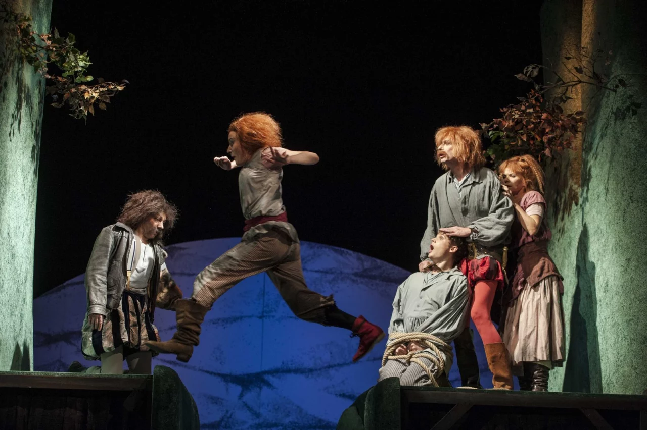 Gerade mal fünf Schauspieler stehen in Detmold auf der Bühne. Und die sind von Regisseur Alexander Flache so geschickt eingesetzt, dass die Zuschauer den Eindruck haben, sie hätten es mit zwei großen Räuberbanden zu tun. Und mit Graugnomen, Wilddruden und Rumpelwichten obendrein. Flache schafft in seiner Inszenierung eine gute Mischung aus berührenden und turbulenten Sequenzen, erzählt mit Tiefgang, Witz und zum Mitfiebern spannend. Immer wieder mal setzt er, etwa wenn er die Rumpelwichte skandieren lässt „Wir sind der Wald, wir sind der Wald“, federleichte aktuelle Akzente.
