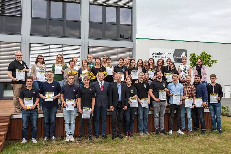 Die Auszubildenden des Gastgeberbetriebes hatten vor Ort ein kleines Programm für ihre Altersgenossen vorbereitet. Einerseits um ihnen zu zeigen, wie der eigene Alltag im Augustdorfer Industriebetrieb aussieht, andererseits um genau zu zeigen, was die Firma Windmöller eigentlich produziert. Die gut 60 Gäste wurden dazu einmal durch den wesentlichen Bereich der Produktion und das Lager des Fußbodenherstellers geführt.