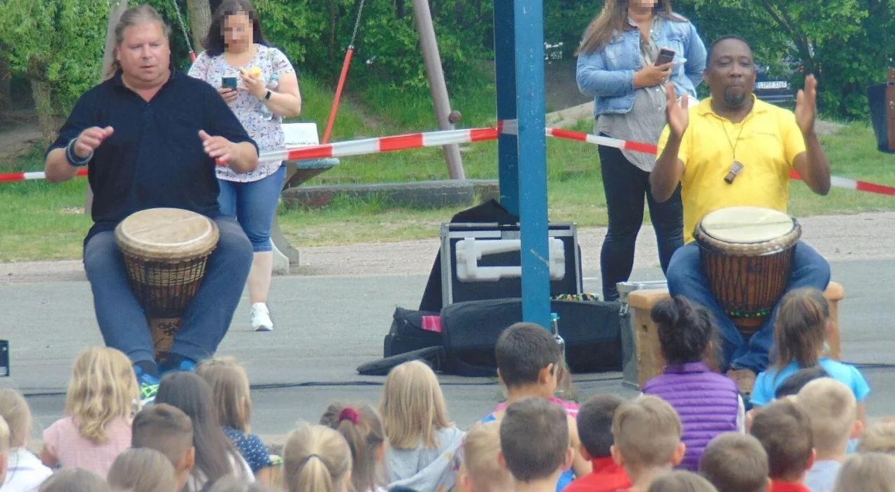 Ziel des Projektes sei es, allen Kindern einen spielerischen Zugang zur eigenen Kreativität zu ermöglichen, die afrikanische Kultur kennenzulernen, das Selbstwertgefühl zu steigern, die Konzentrationsfähigkeit zu fördern und soziale und kulturelle Grenzen zu überwinden. Jeweils zwei Jahrgänge versammelten sich in der Sporthalle und erlebten die Workshops zusammen. "Alle Kinder waren begeistert und machten von an Anfang an mit leuchtenden Augen mit. Auch das Kollegium beteiligte sich begeistert an dem gemeinsamen Trommeln", heißt es in dem Bericht der Schule. Am Nachmittag fand das gemeinsame Abschlusskonzert statt. Um 15 Uhr versammelten sich alle Kinder mit ihren Eltern auf dem Schulhof und gaben unter Anleitung des Teams vom „Trommelzauber“ ein Konzert, bei dem auch die Eltern mit kleinen Bewegungseinlagen einbezogen wurden.
