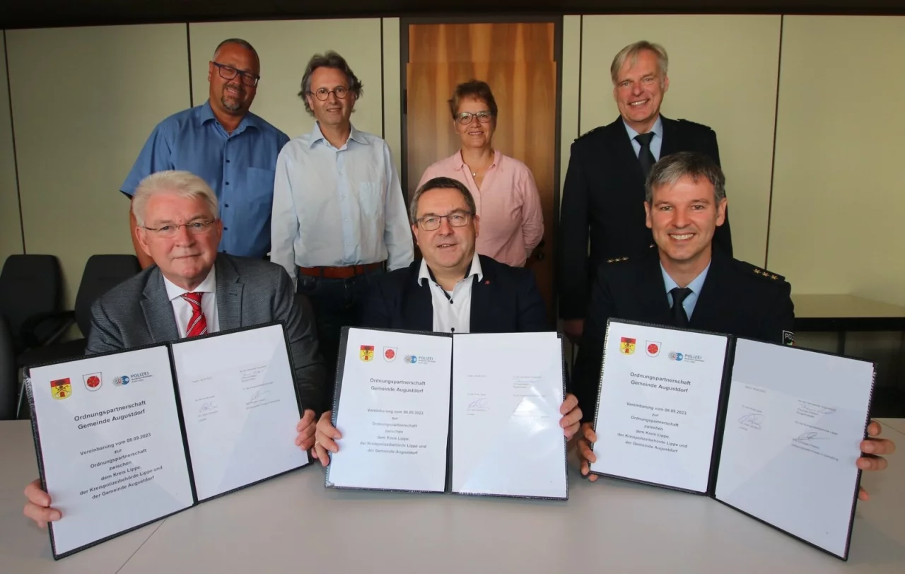 Augustdorf. Der Kreis Lippe, die Gemeinde Augustdorf und die Kreispolizeibehörde Lippe haben eine Ordnungspartnerschaft geschlossen. "Um gemeinsam für mehr Sicherheit in Augustdorf zu sorgen", wie es in einer Pressemitteilung des Kreises heißt. Auslöser sei vor allem die Situation in der Wohnsiedlung "Am Dören" gewesen. Dort hätten Bürgerinnen und Bürgern zuletzt immer wieder von Vandalismus, Vermüllung oder aggressivem Verhalten anderer Mitmenschen berichtet und die Behörden um Hilfe gebeten.