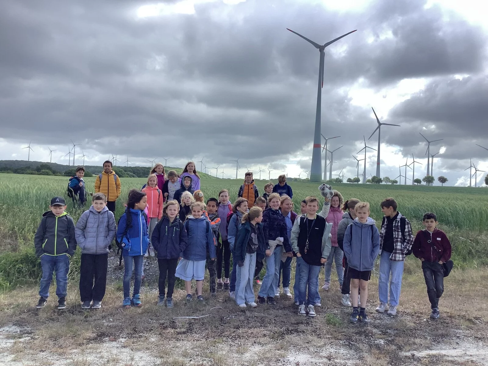 Die Klassen 4a und 4b konnten dabei eine ganz besondere Erfahrung machen: Im Rahmen des Bildungsprojekts „transMINT4.0 – Grenzen überwinden, MINT-Bildung verbinden“ besuchten sie eine Windkraftanlage in Benhausen und tauchten tief in das Thema Windenergie ein.