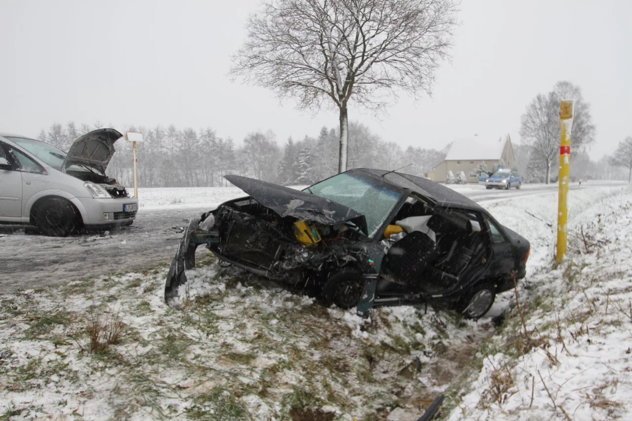 Der Bad Salzufler wurde in seinem Opel eingeklemmt und musste von der Feuerwehr Leopoldshöhe mit Spezialwerkzeug befreit werden. Er kam schwerverletzt ins Krankenhaus. Der 59-Jährige konnte sich mit leichten Verletzungen selbst aus dem zerstörten Wagen befreien. Die Polizei geht nach ersten Erkenntnissen von einer nicht angepassten Fahrweise bei schneeglatter Straße aus. Zur genauen Unfallursache laufen die Ermittlungen.