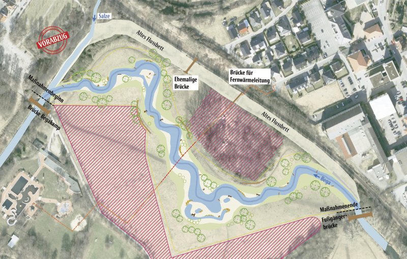 Nach dem bislang letzten Eingriff des Menschen Anfang der 1960er Jahre verläuft der Fluss in diesem Bereich aktuell als begradigtes und strukturarmes Gewässer. Geht es nach den Planern, wird sich die Bega dagegen zukünftig wieder in sanften Schwüngen durch die Hoffmannswiesen schlängeln - und so auch um rund 210 Meter wachsen.