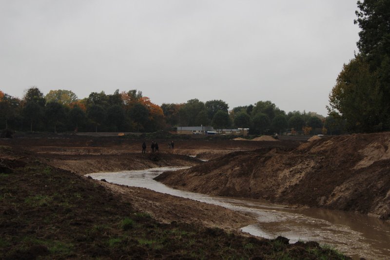 Statt wie bislang verborgen am Rand der Hoffmannswiesen zu fließen, schlängelt sich das Flüsschen jetzt mitten durch das Gelände, wie auf dem Foto mit dem Begabad im Hintergrund zu sehen ist. Von dem Grün ist aufgrund der Bauarbeiten zwar nicht viel übrig geblieben, doch spätestens im Frühjahr sollen in dem Naherholungsgebiet wieder die Pflanzen sprießen. Kommende Woche wird die Stadt das Areal noch planieren, dann soll die Natur dort wieder das Zepter übernehmen.