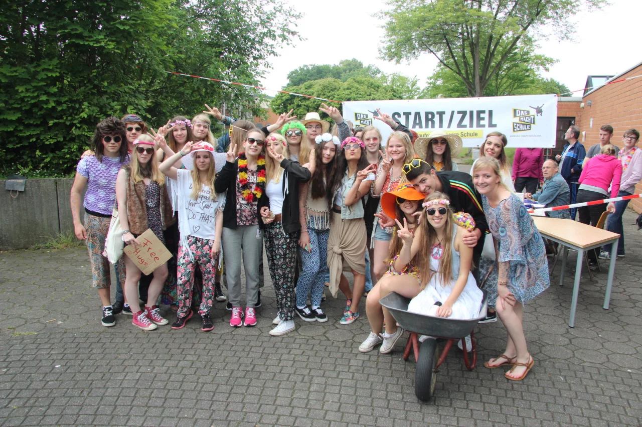 In der Woche vor der großen Abschiedsfeier stellen die Jugendlichen derzeit jeden Tag unter ein anderes Motto – die passenden Kostüme inklusive. Gestern waren laut dieser launigen Selbstverpflichtung Hippies gefragt. So kam es, dass beim Sponsorenlauf, der mehr oder weniger zufällig in diese Lebensphase fiel, bunte Verkleidungen an allen Ecken zu bewundern waren. Selbst eine Schubkarre drehte ihre Runden um die Sporthalle – stets besetzt von einem Schüler oder einer Schülerin bei der Verschnaufpause.