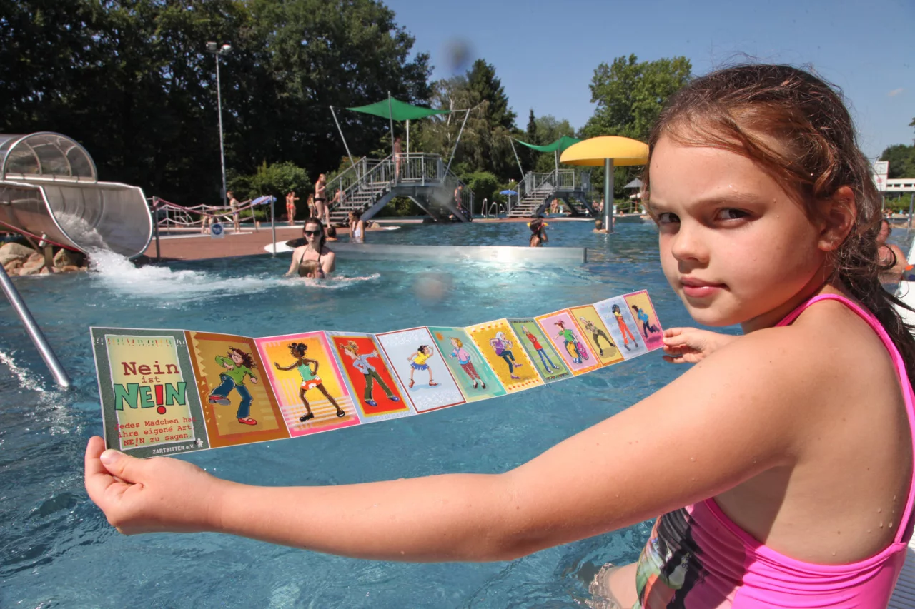 Unter dem Motto „Stopp mit lustig – gegen Belästigungen in Schwimmbädern" wurde Kindern und Jugendlichen erklärt, wie sie sich verhalten können, wenn sie in entsprechende Situationen geraten. Damit auch im Alltag jederzeit ein qualifizierter Ansprechpartner zur Verfügung steht, sind zudem alle Angestellten des Freibads geschult worden.
