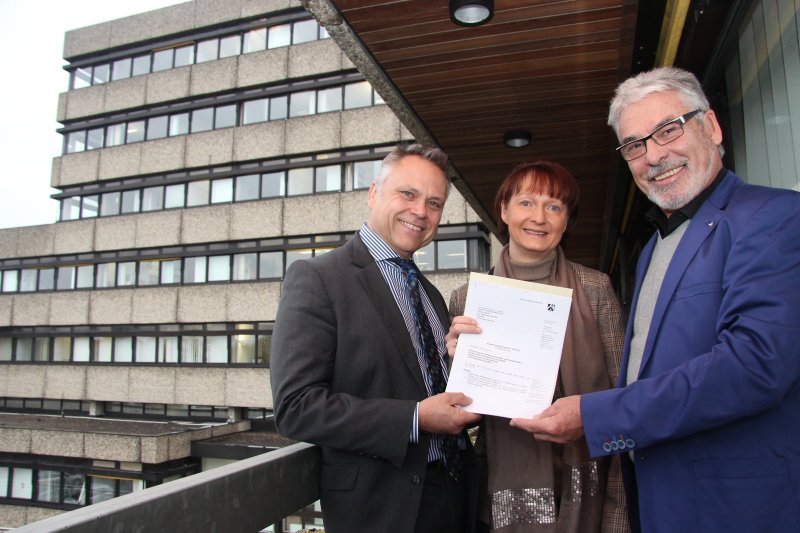 Strahlende Gesichter: Der Zustand der Rathausfassade kann Bürgermeister Roland Thomas (links) und Beigeordneten Rolf Oberweis sicher nicht freuen. Der Förderbescheid, überreicht von Anke Recklies (Bezirksregierung Detmold), dagegen schon. (© Stefan Backe)
