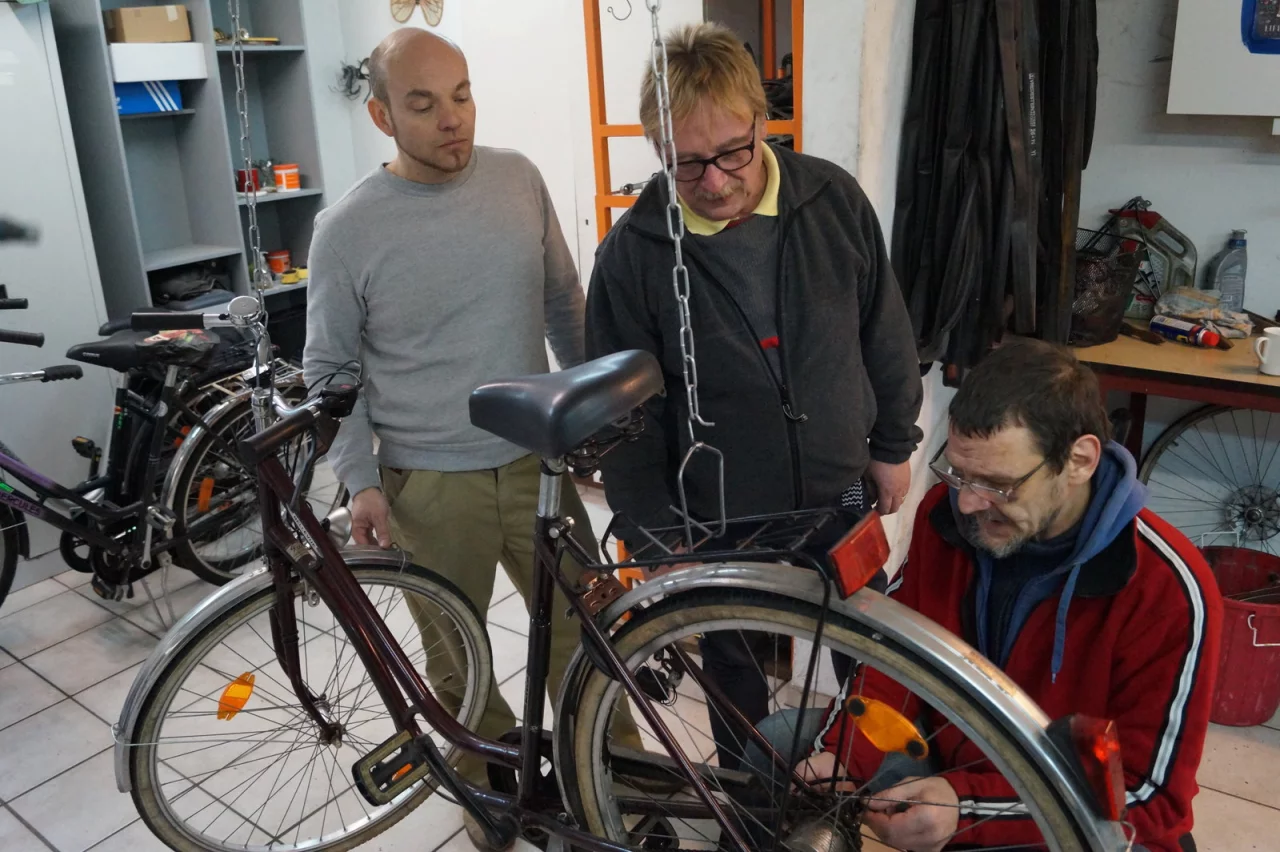 „Wir haben den Anspruch, die Materialkosten mit dem Verkaufspreis wieder hereinzubekommen", erklärt er. „Lohnkosten berechnen wir nicht." Nur so sei die Abgabe für 30 Euro pro Stück möglich. Christian Möller hat derweil die Clickbox der Sieben-Gang-Nabenschaltung neu montiert. Nun müssen noch Speichen eingezogen, Reflektoren befestigt und die Bremsen neu eingestellt werden. „Aber dann dürfte das Fahrrad wieder verkehrssicher sein."