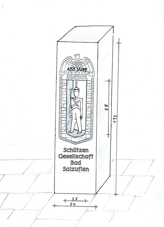 Das Denkmal: Eine mannshohe Sandsteinstele – so stellen sich die Initiatoren aus der Schützengesellschaft das Denkmal bislang vor. Auf einer Seite soll in einer Nische eine Figur in Form eines Lippischen Schützen eingefräst werden. Zudem planen sie den Schriftzug „450 Jahre Schützengesellschaft Bad Salzuflen". Die Stele soll um 1,90 Meter hoch werden und ein Grundmaß von etwa 50 Quadratzentimeter haben. Die Details stehen aber noch nicht fest.