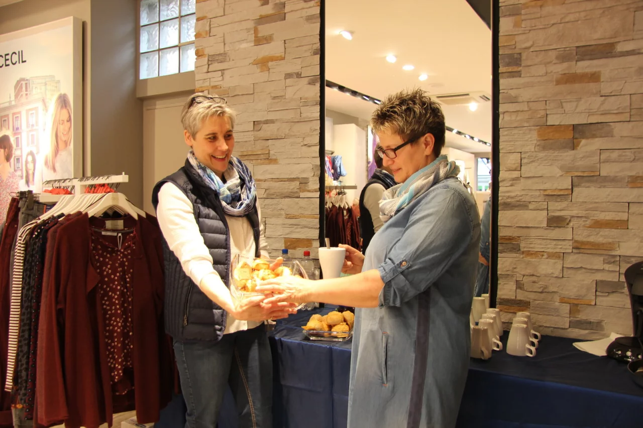 Unter ihnen war auch Amalia Schmidt, die ein sommerliches Jeanskleid anprobierte. Aus der Zeitung und per Flyer hatte sie von der Aktion erfahren und hoffte, einen von drei 50-Euro-Gutscheinen im Laden zu gewinnen, um beim morgendlichen Einkauf ordentlich zu sparen. Ebenso ging es auch den Berliner Gästen, die das Geschäft gezielt nach dem Wochenmarkt ansteuerten und sich von Martina Mönnekes mit Scones und Kaffee verwöhnen ließen.