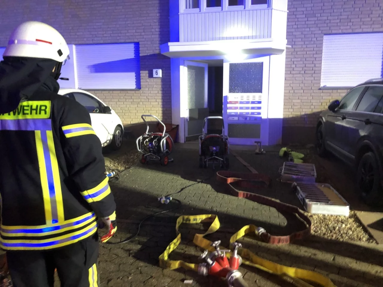 Gegen kurz nach halb fünf Uhr am Neujahrsmorgen schrillten die Alarmempfänger der Wehrleute. Bereits auf der Anfahrt zu der Straße in der Nähe des Kurzentrums kam die Rückmeldung von einem Anrufer, dass dicker, schwarzer Qualm aus dem Keller aufsteigt und sich möglicherweise noch Menschen in dem Gebäude befinden. Um für den Ernstfall genügend Kräfte vor Ort zu haben, erhöhte die Wehr auf das Alarmstichwort „Feuer 3 – Menschenleben in Gefahr".