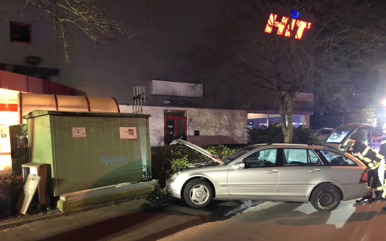 Bad Salzuflen-Schötmar. Ein Fahranfänger hat am Samstagabend einen Verkehrsunfall mit hohem Sachschaden verursacht. Der junge Mann kam gegen 19 Uhr von der Schloßstraße und wollte nach rechts in die Straße "Am alten Teich" einbiegen. Dabei geriet er aus unbekannter Ursache auf die gegenüberliegende Straßenseite und touchierte dort den Bordstein. Anschließend lenkte er auf die andere Straßenseite und fuhr mit seinem Mercedes vor dem dortigen "HIT-Markt" gegen eine Gasdruckregelanlage der Stadtwerke. Durch die Wucht des Aufpralls wurde das Gas-Häuschen vom Sockel gedrückt und die Anlage undicht. Gas strömte aus.