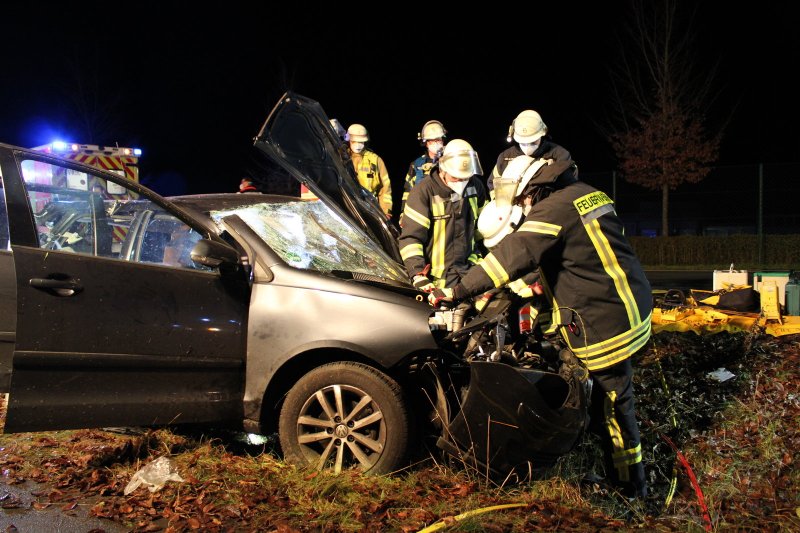 Zeugen benachrichten die Polizei und betreuten die junge Frau bis zum Eintreffen der Einsatzkräfte. Die Feuerwehr, die mit rund 30 Einsatzkräften vor Ort war, musste die Frau mit patientenschonender Rettung aus dem PKW befreien. Zusätzliche Herausforderungen waren laut Angaben der Feuerwehr die nicht ausgelösten Airbags sowie die stark deformierte Karosserie des Fahrzeuges, die ein Abklemmen der Batterie zunächst nicht möglich machte. Es bestand die Gefahr, dass die Airbags jederzeit nachträglich noch auslösten und Patientin und Einsatzkräfte verletzten. Nachdem die junge Frau vom Rettungswagen ins Krankenhaus gebracht wurde, unterstützte die Feuerwehr die Polizei bei der Unfallaufnahme mittels der Drehleiter. Die Heerserheider Straße war in der Nacht zum Montag noch bis etwa 1 Uhr gesperrt.Der Sachschaden liegt laut Polizeibericht bei etwa 4000 Euro. Hinweise nehmen die Beamten unter 05222-98180 entgegen.