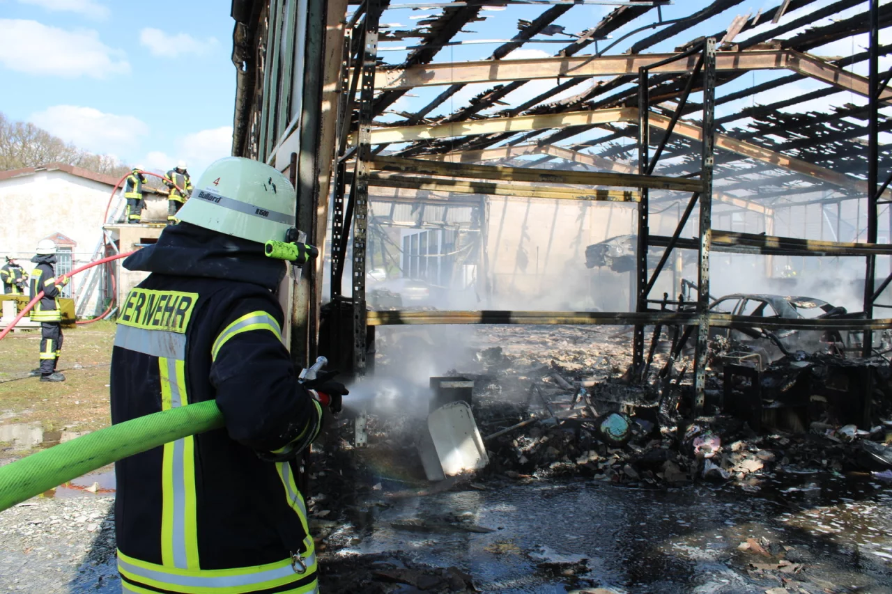 Die Halle sei stark einsturzgefährdet und könne nicht betreten werden, so die Polizei in einer Stellungnahme. Den Sachschaden beziffern die Beamten auf mehrere Hunderttausend Euro.