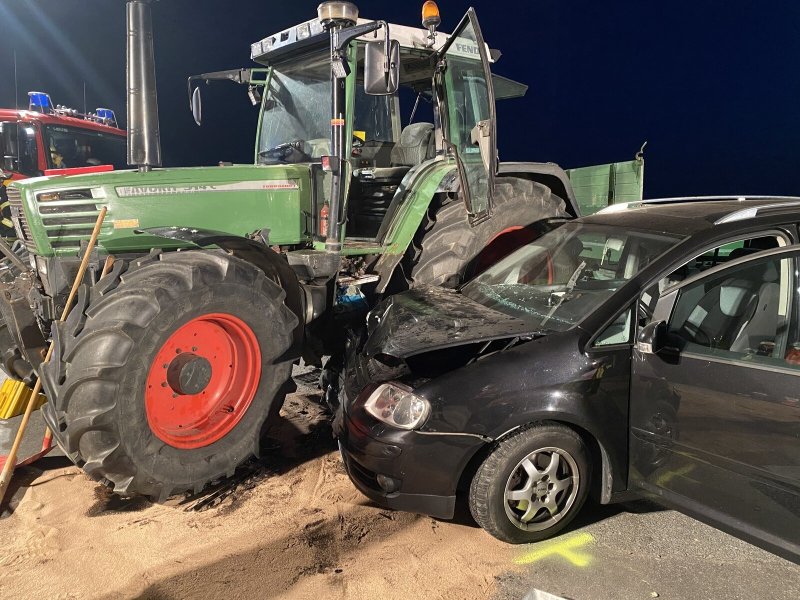 Laut Polizeibericht wollte der 19-jährige Fahrer des Traktors mit Hänger nach links in die Einmündung Lehof abbiegen, als ein nachfolgender 46-jähriger Autofahrer zum Überholen ansetzte. Es kam daher zum Zusammenstoß der Fahrzeuge, heißt es weiter. Die Beifahrerin des 46-Jährigen sowie zwei ihrer Kinder wurden leicht verletzt und zur ambulanten Behandlung ins Klinikum gebracht. Durch die Kollision trat Diesel aus dem Tank des Traktors aus. Die Feuerwehr streute die Fahrbahn ab und nahm nach Rücksprache mit dem Kreisumweltamt Erde ab, um den ausgelaufenen Kraftstoff aufzunehmen. Für die Dauer der Unfallaufnahme und die Maßnahmen der Feuerwehr wurde die Fahrbahn gesperrt.