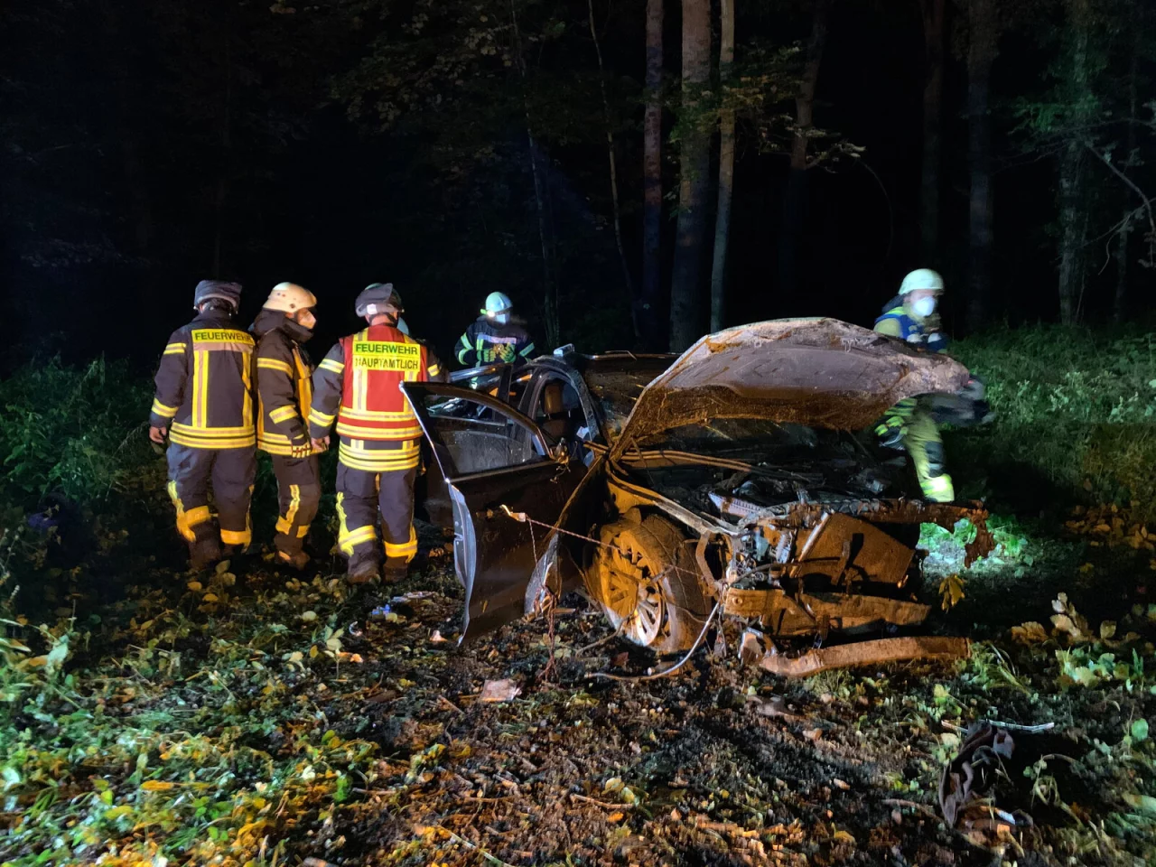Nach ersten Erkenntnissen der Feuerwehr kam ein Audi A6 gegen 4.20 Uhr auf der Salzufler Straße zwischen Wüsten und Bad Salzuflen nach rechts von der Straße ab und landete nach etwa 100 Metern auf einem Waldweg. Dort kollidierte er mit einem Erdhügel, verlor die Bodenhaftung und wurde gegen einen Baum geschleudert, schreibt die Polizei. Durch die Wucht des Aufpralls wurden die drei Insassen, zwei Männer und eine Frau, in dem Wagen eingeklemmt und mussten von der Freiwilligen Feuerwehr Bad Salzuflen mittels schwerem Gerät aus dem Fahrzeug befreit werden.