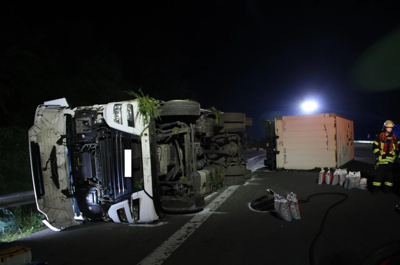 Gegen kurz vor zwei Uhr ist ein Gliederzug in Fahrtrichtung Dortmund nach rechts von der Straße abgekommen und hat einige hundert Meter der Bankette touchiert. Rund einen Kilometer vor der Raststätte Lipperland Nord kippte das Gespann auf die Fahrbahn. Der vordere Teil fiel nach rechts, der Anhänger blieb auf der linken Seite liegen. Da laut Feuerwehr zunächst nicht klar war, ob und wie schwer die Menschen im Fahrerhaus verletzt waren, alarmierte die Leitstelle Lippe die Einsatzkräfte.