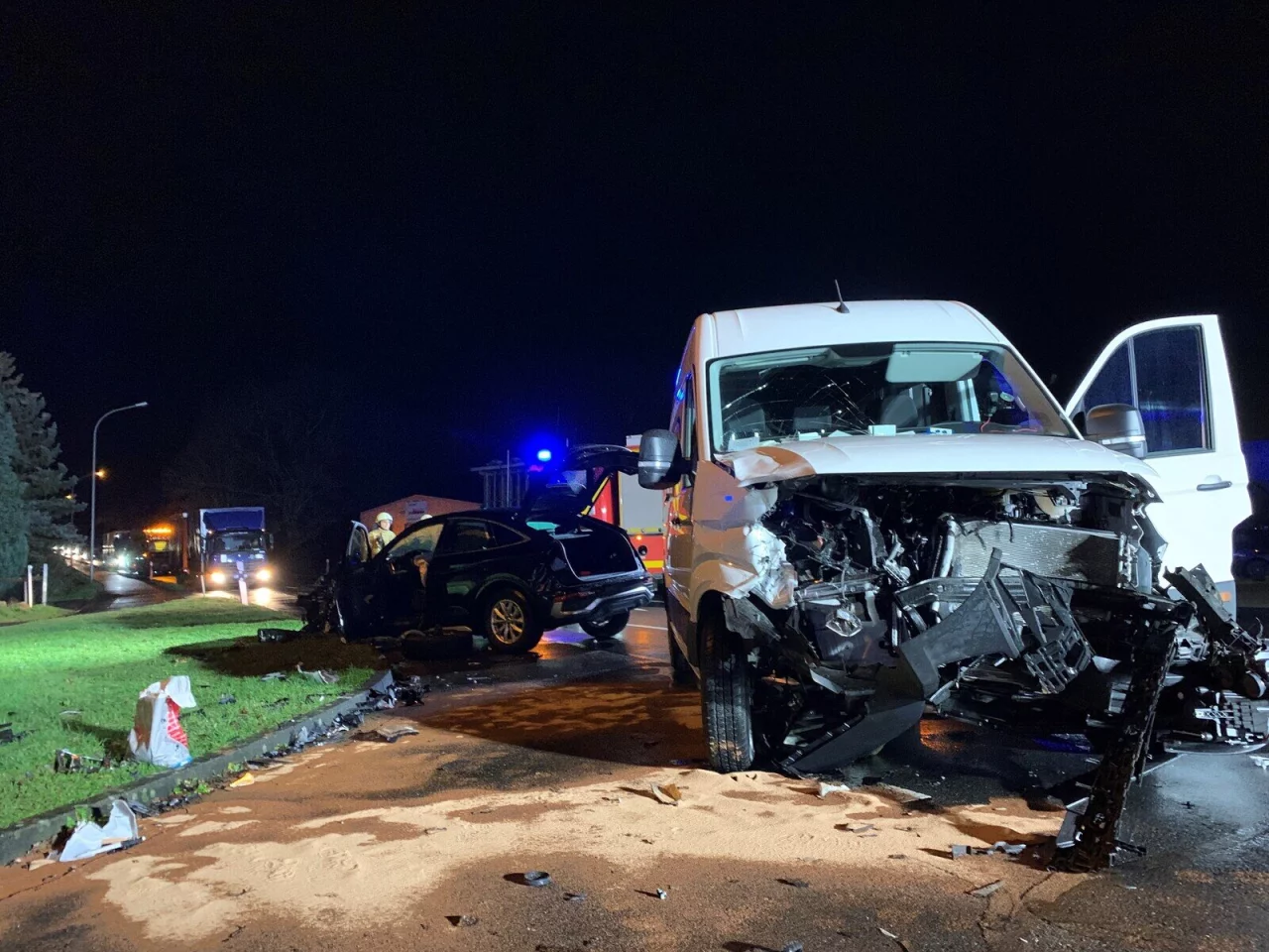 Die rund 25 Einsatzkräfte der Feuerwehr stellten zunächst den Brandschutz sicher und trennten die Batterie des E-Autos ab. Außerdem streuten die Helfer ausgelaufene Betriebsstoffe ab. Beide Fahrzeuge waren nicht mehr fahrbereit und mussten abgeschleppt werden. Zur Unfallursache hat die Polizei die Ermittlungen aufgenommen. Auch die genaue Schadenshöhe steht noch nicht fest, dürfte sich aber in einem höheren fünfstelligen Betrag bewegen.