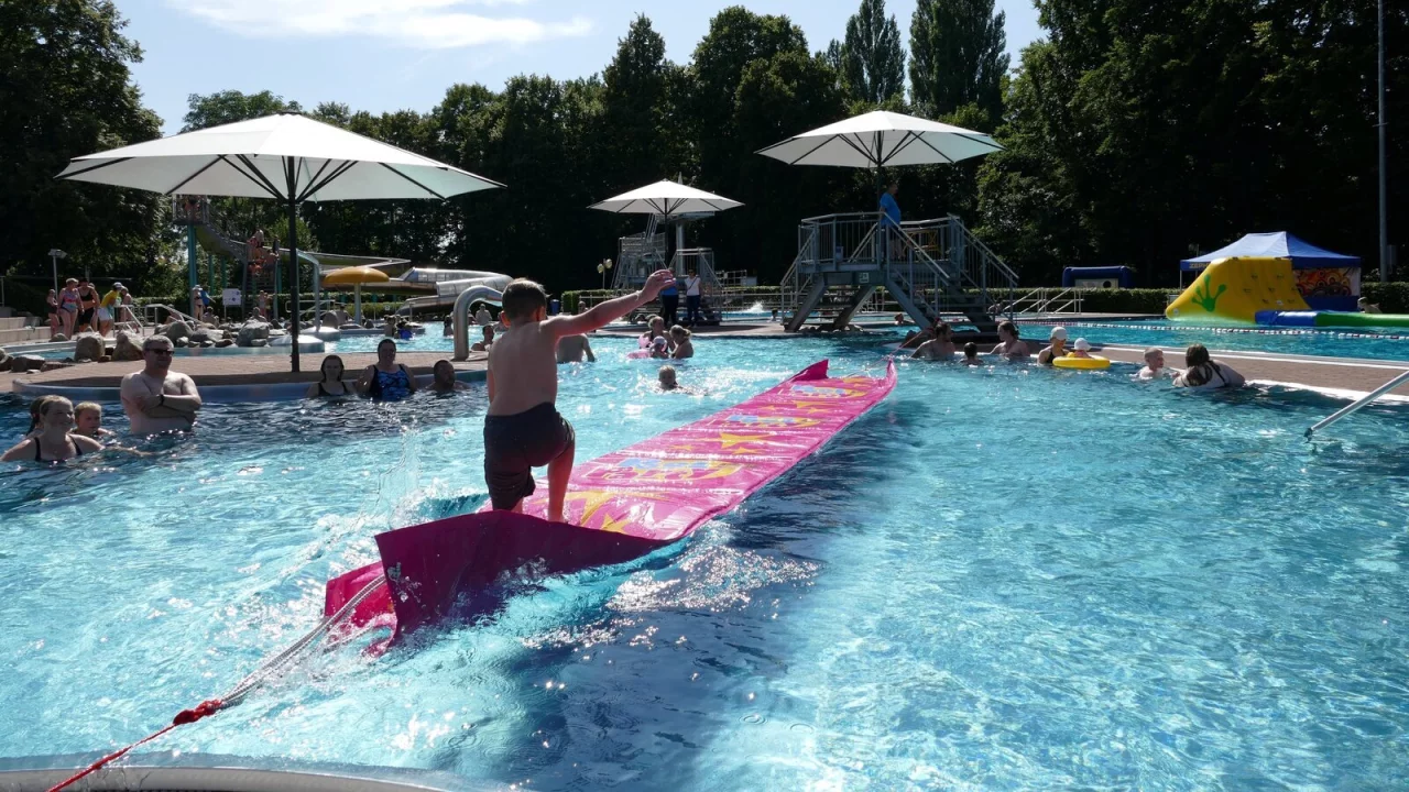 Seifenblasen, Torwand, Dribbel-Parcours, Springseile, Rasen-Ski, Pedalos, Stelzen oder Hüpfsäcke runden das Angebot ab. Für die notwendige Stärkung zwischendurch sorgt der Freibad-Kiosk „Freischwimmer“.