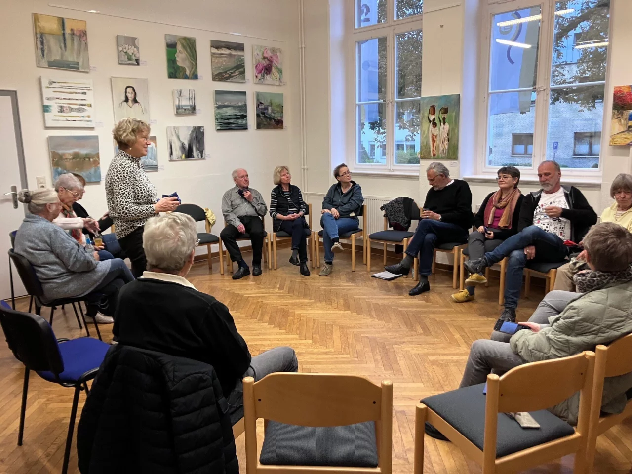 Bei Kuchen und Getränken kamen die Gäste der Finissage miteinander ins Gespräch. „Das ist das Schöne an Ausstellungen; Künstlerinnen und Künstler unterschiedlicher Kurse bekommen ein gemeinsames Forum für den Austausch“, freute sich Monczynski.