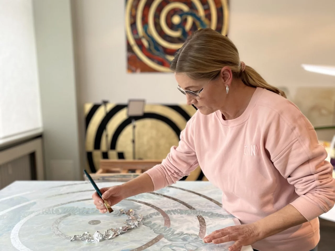 Beim näheren Betrachten der großformatigen, farbenprächtigen Bilder ergebe sich eine Mischung aus frei fließenden und streng geometrischen Formen. „Meist sind es Kreise, die den scheinbar wild durcheinanderlaufenden Farben Halt geben.“ Die Bilder spiegelten das Seelenleben der Künstlerin wider. „Da ist auf der einen Seite das Adrenalin, wie es Petra Seidel nennt – die Lust, Neues auszuprobieren und Dingen ihren freien Lauf zu lassen. Und auf der anderen Seite das Streben nach persönlicher Perfektion, die Suche nach Harmonie und Gleichgewicht. Letzteres findet in den meist in warmen Goldtönen gehaltenen Kreisen seinen Ausdruck.“