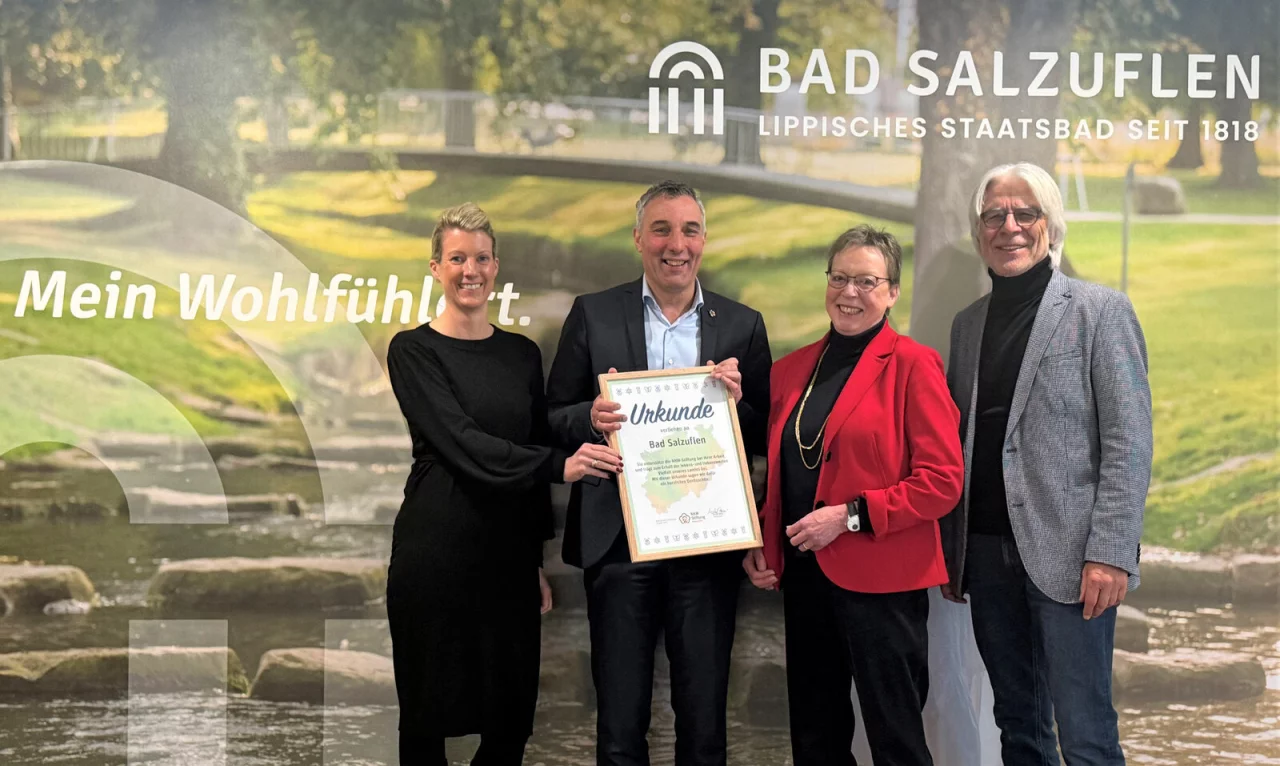 Bad Salzuflen. Die Stadt Bad Salzuflen ist seit Anfang des Jahres Mitglied im Förderverein Nordrhein-Westfalen-Stiftung. Der beschäftigt sich mit den Themen Natur, Landschaft, Denkmäler und Kulturgüter, „um das Heimatgefühl von Bürgerinnen und Bürger zu sichern“, wie es in einer Pressemitteilung der Stadt heißt. Bei einem Besuch in den Räumlichkeiten des Kurgastzentrums in der Salzestadt überreichte Marianne Thomann-Stahl, stellvertretende Vorsitzende des Fördervereins der NRW-Stiftung, gemeinsam mit Hans Feuß, ehrenamtlicher Regionalbotschafter der Stiftung, offiziell die Mitgliedsurkunde an Bürgermeister Dirk Tolkemitt sowie die Erste Beigeordnete und Stadtkämmerin Melanie Koring.