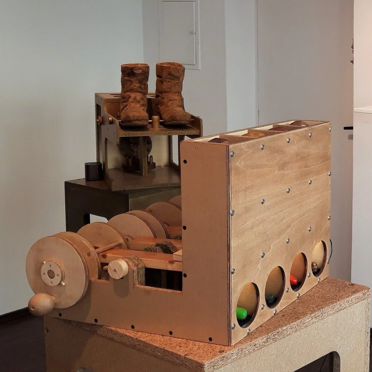 Wie Grimann ist auch Gottfried Strathmeier Mitglied im „Fachwerk“ und darüber hinaus in anderen Künstlervereinigungen der Region engagiert. Die Werke des Bielefelders waren unter anderem letztes Jahr im Düsseldorfer Landtag zu sehen. Er zeigt Arbeiten zu den Themenfeldern Gesellschaft und Individuum, Technik und Natur. Der Frage nach dem Status unserer Gesellschaft und dem Stellenwert des Individuums geht Strathmeier mit einer technischen Bildsprache nach, die er in überwiegend aus Holz gefertigten Apparaten zeigt. Jedes Stück hat einen Mechanismus, der von den Besuchern der Ausstellung betätigt werden kann.