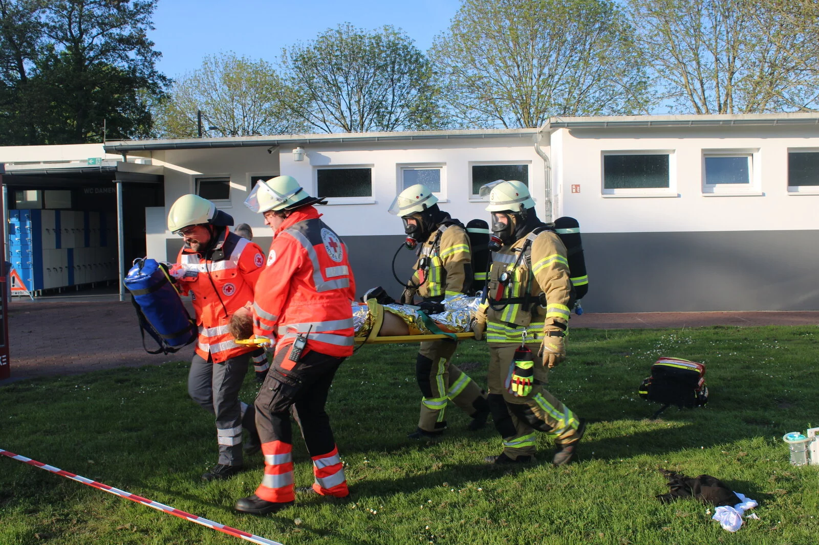 Wenig später ist sie in den Händen des Rettungsdienstes des Deutschen Roten Kreuzes. Die Ehrenamtlichen übernehmen die Erstversorgung. Ein weiterer Trupp zwängt sich bei handgemessenen 23 Grad Lufttemperatur in luftdichte Chemikalienschutzanzüge. Kein leichtes Unterfangen, doch es muss zügig gehen. Schließlich muss die „Gefahr“, das defekte Flaschenventil der Chorgas-Flasche, noch abgedichtet werden. Bis zu dem Zeitpunkt wissen sie noch nicht, dass es sich um eine Übung handelt.