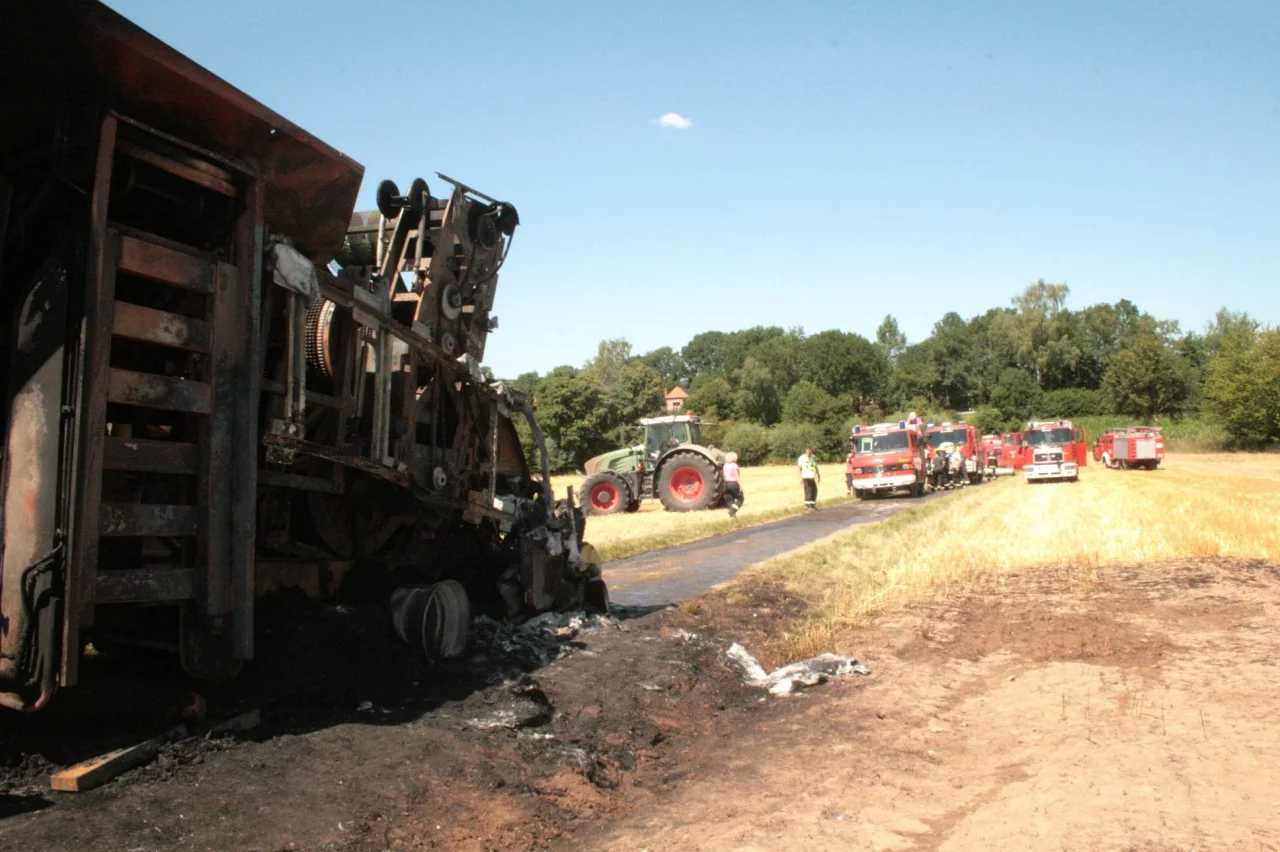 Geistesgegenwärtig hatten die Betroffenen mit Hilfe aus der Nachbarschaft begonnen, um das in Flammen stehende Ackerstück mit landwirtschaftlichem Gerät eine Feuersperre zu ziehen. So wurde die Brandstelle auf eine Größe von etwa 500 Quadratmetern eingegrenzt, das die Feuerwehr rasch löschte. Die Erntemaschine brannte jedoch völlig aus. Der Sachschaden soll im sechsstelligen Bereich liegen.