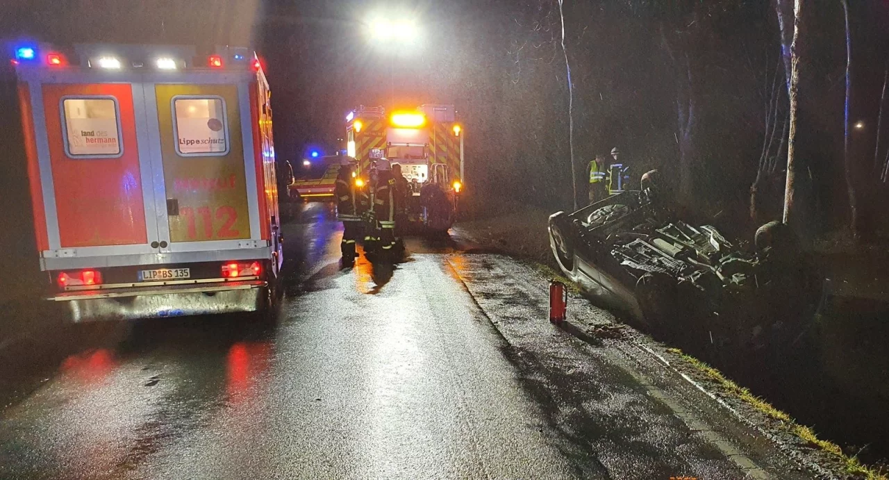 Barntrup. Ein Auto ist am Donnerstagmorgen auf der Detmolder Straße zwischen Selbeck und Barntrup von der Straße abgekommen, hat sich überschlagen und ist schließlich im Straßengraben zum Liegen gekommen.
