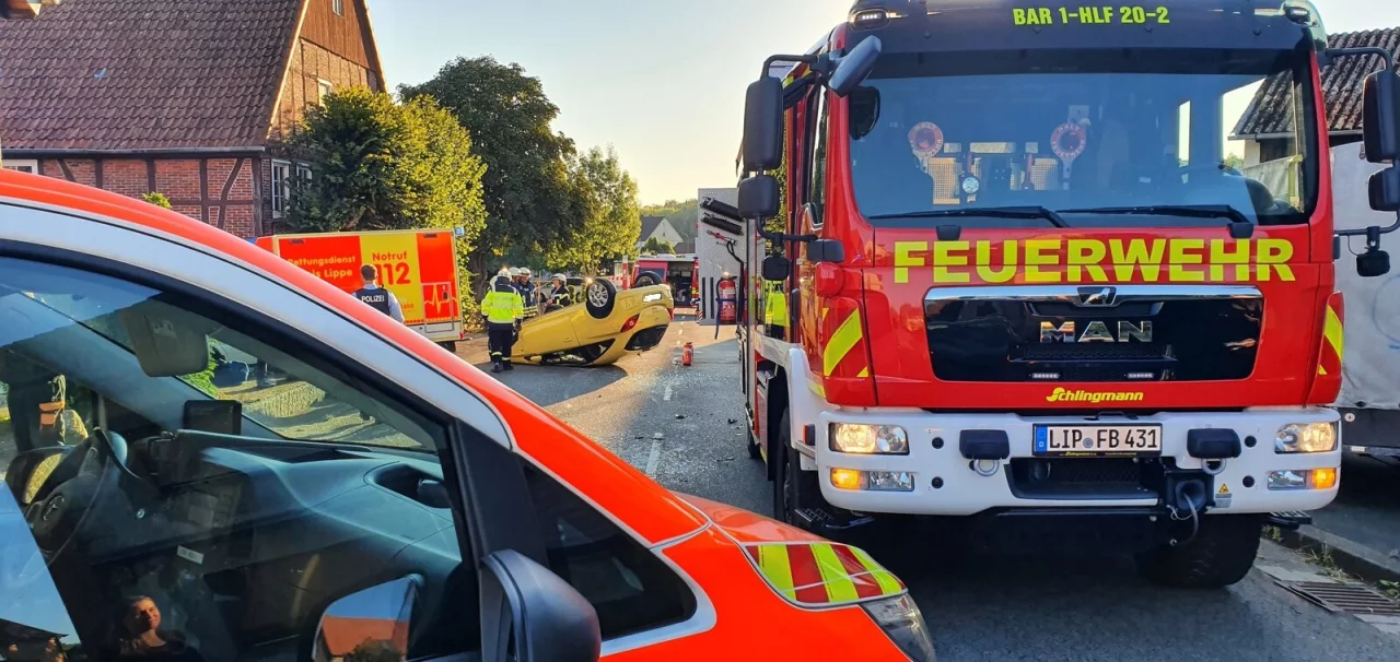 Barntrup-Selbeck. Bei einem Verkehrsunfall in Selbeck am Freitagmorgen hat sich nach Angaben der Freiwilligen Feuerwehr Barntrup auf der Detmolder Straße ein Auto überschlagen. Der Alarmierung sei um 7.19 Uhr erfolgt, so die Feuerwehr in Barntrup. Die Leitstelle des Bevölkerungsschutzes Lippe hatte alle drei Einsatzabteilungen der Freiwilligen Feuerwehr Barntrup (dazu gehören neben Barntrup auch Alverdissen und Sonneborn) alarmiert. Denn es hatte zunächst geheißen, dass eine Person in ihrem Fahrzeug klemmte. Doch engagierte Ersthelfer, die den Notruf abgesetzt hatten, haben es geschafft, bis zum Eintreffen der ersten Feuerwehr-Fahrzeuge die Person aus dem Fahrzeug zu befreien. Von daher konnten die Feuerwehr-Einsatzabteilungen aus Alverdissen und Sonneborn ihre Fahrt abbrechen und umkehren. Bis zum Eintreffen des Rettungsdienstes hätten die Ersthelfer dann die Person weiter vorbildlich betreut. Die Einsatzabteilung Barntrup sperrte die Straße ab und sicherte die Unfallstelle. Die polizeilichen Ermittlungen laufen.