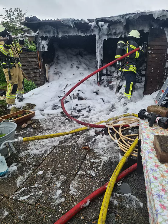 Zusätzlich ging ein Atemschutztrupp zur Brandbekämpfung des Schuppens vor. Das Feuer konnte schnell unter Kontrolle gebracht werden. Für die weiteren Nachlöscharbeiten kamen zwei weitere Atemschutztrupps zum Einsatz. Das Dach musste geöffnet und der Schuppen vollständig mit Schaum abgelöscht werden.