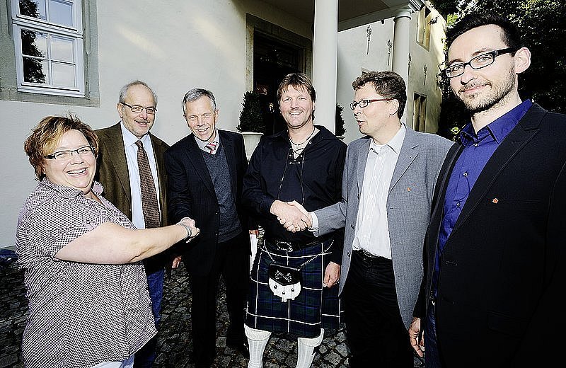 Barntrup-Alverdissen (khk). Vor zehn Wochen ging vor dem Alverdisser Schloss die Benefizveranstaltung "Lippe meets Scotland" über die Bühne. Jetzt haben an gleicher Stelle die Organisatoren die stattliche Summe von 16.100 Euro als Spende an die Gesundheitsstiftung Lippe und das Kinder- und Jugendhospiz Bethel überreicht.