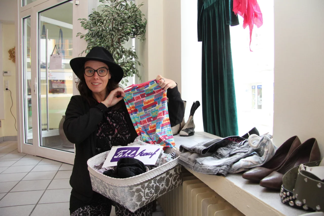 Beim Label „Fehlkauf“ – auf Englisch „buyers regret“ – geht es um den Wert der Dinge: „Hier sind ja meist Einzelstücke, und jedes hat seine Geschichte. Ganz oft hängt sogar noch das Kaufetikett dran.“ Die Resonanz in Blomberg sei toll: „Gestern hat sich eine Dame komplett hier eingekleidet.“