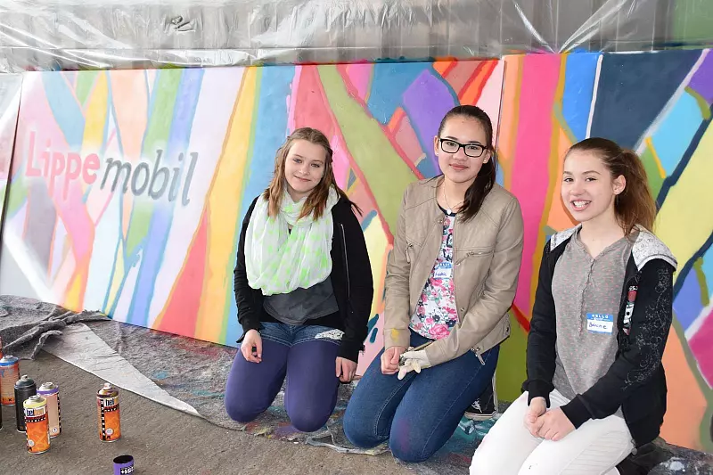 Zum 20. Geburtstag hatte die KVG einen Wettbewerb ausgeschrieben, sieben Schulen hatten teilgenommen. Jasmin, Sophia und Janine(von links) vom Hermann-Vöchting-Gymnasium Blomberg überzeugtem mit ihrem farbenfrohen Entwurf die Jury, 77 Einsendungen gab es laut Pressemitteilung insgesamt. Die Schülerinnen gewannen einen professionellen Sprayworkshop und setzten den Entwurf unter Anleitung von Ingmar Süß vom „Projekt Graffiti" auf einem Bus um.