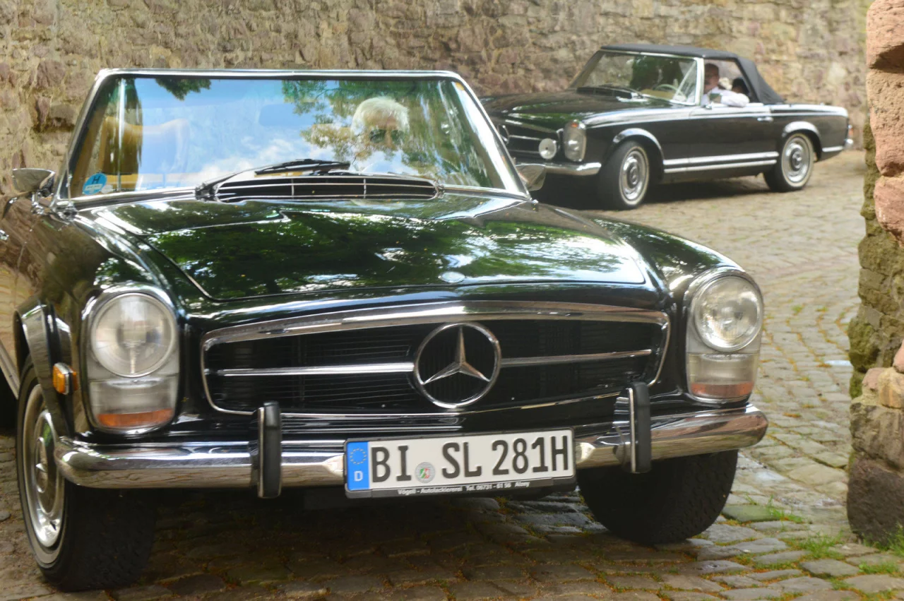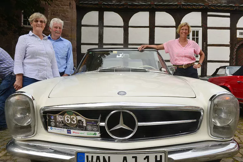 „Wir sind mit 13 Fahrzeugen und 24 Personen unterwegs", berichtete Erika Gerlach, die die Ausfahrt gemeinsam mit Lebensgefährte Reinhard Laß organisiert hatte. Klar, dass der 280 SL der beiden als erstes durch den Torbogen der Burg rollte. Drei Clubmitglieder hatten wegen der unsicheren Wetterlage ihre „Pagoden" in der heimischen Garage gelassen. Sie waren mit jüngeren SL-Baureihen als der legendären W113 aus den Jahren 1963 bis 1971 annähernd stilecht unterwegs.