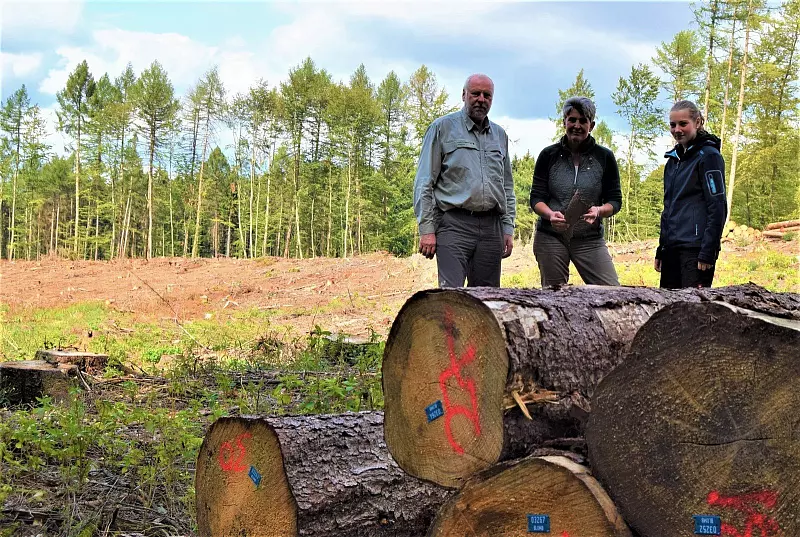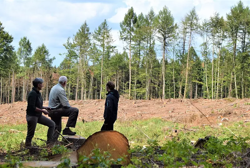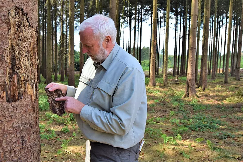Schon jetzt stößt man im Waldgebiet jeden Tag auf mehr Freiflächen. Auf dem Boden finden sich untypisch grüne Nadeln und rund um die noch verbliebenen Bäume liegt eine Schicht aus feinem, zimtfarbenen Pulver – das Ergebnis der Arbeit des Buchdruckers, desjenigen Borkenkäfers, der hier in Blomberg fleißig am Werk ist. Der eingesetzte Harvester arbeitet sich Tag für Tag weiter voran, fällt Baum für Baum, und kann trotzdem nicht mit dem enormen Tempo der Borkenkäferpopulation mithalten. Dieser Teil des Stadtforstes, in dem die Situation aktuell am dramatischsten ist, befindet sich knapp außerhalb des ausgewiesenen Naturschutzgebietes „Wälder bei Blomberg". Doch auch die vielen Fichten innerhalb des Schutzgebietes, deren Nadeln zum Teil noch keine braune Verfärbung aufweisen, sind befallen und werden in den nächsten Monaten abgeholzt. „Das wird riesige Folgen nach sich ziehen, sowohl finanziell als auch für die Natur", weiß Radeck.