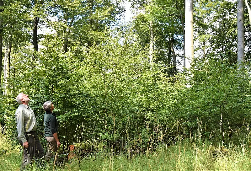 Und die Fichte ist nicht der einzige Baum, der den Forstwirten zur Zeit Sorgen bereitet: Die dominierende Baumart im Gebiet, die Buche, kränkelt ebenfalls. Seit letztem Sommer leidet sie unter erheblichen Vitalitätsproblemen und bildet immer lichtdurchlässigere Kronen mit kleineren Blättern und unbelaubten Astabschnitten aus. Das Laub einiger Exemplare verfärbt sich gelblich – „eindeutig Trockenheitsstress", beurteilt Susanne Hoffmann, Landesverband Lippe. Dabei verfügt die Buche eigentlich über eine weite Standorttoleranz. Nicht ohne Grund wäre fast ganz Deutschland von Natur aus mit Buchen- oder Buchenmischwäldern bedeckt. „Wenn man in die Kronen hineinschaut, darf man den Himmel eigentlich kaum sehen", beschreibt Hoffmann den Wunschzustand. Wendet man den Blick in den Blomberger Wäldern aktuell nach oben, ist das Blau des Himmels an etlichen Stellen deutlich zu erkennen. Noch sei es zu früh, um konkrete Prognosen für die Buchenwaldbestände zu stellen.