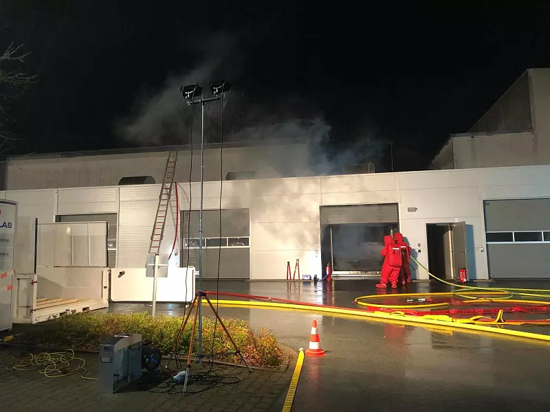 "Da hier gerade Prüfmuster getestet wurden, die bei einem Brand potenziell Schadstoffe freisetzen können, wurde ein ABC-2-Alarm ausgelöst", heißt es in der Meldung. Daher wurden ABC-Kräfte aus der Feuerwehr Blomberg und Barntrup nachalarmiert. Inzwischen schlugen Flammen aus der Lüftung auf das Dach des Gebäudes.