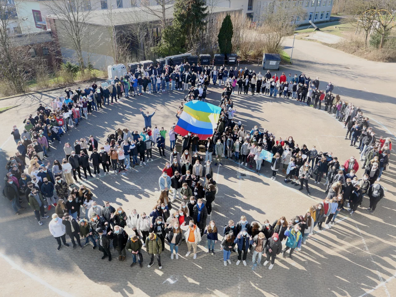 Blomberg. Die Sekundarschule Blomberg zeigt Flagge: Mehr als 500 Schülerinnen und Schüler haben gemeinsam mit ihren Lehrern ein starkes Zeichen des Friedens an die Menschen in der Ukraine und in Russland gesendet.