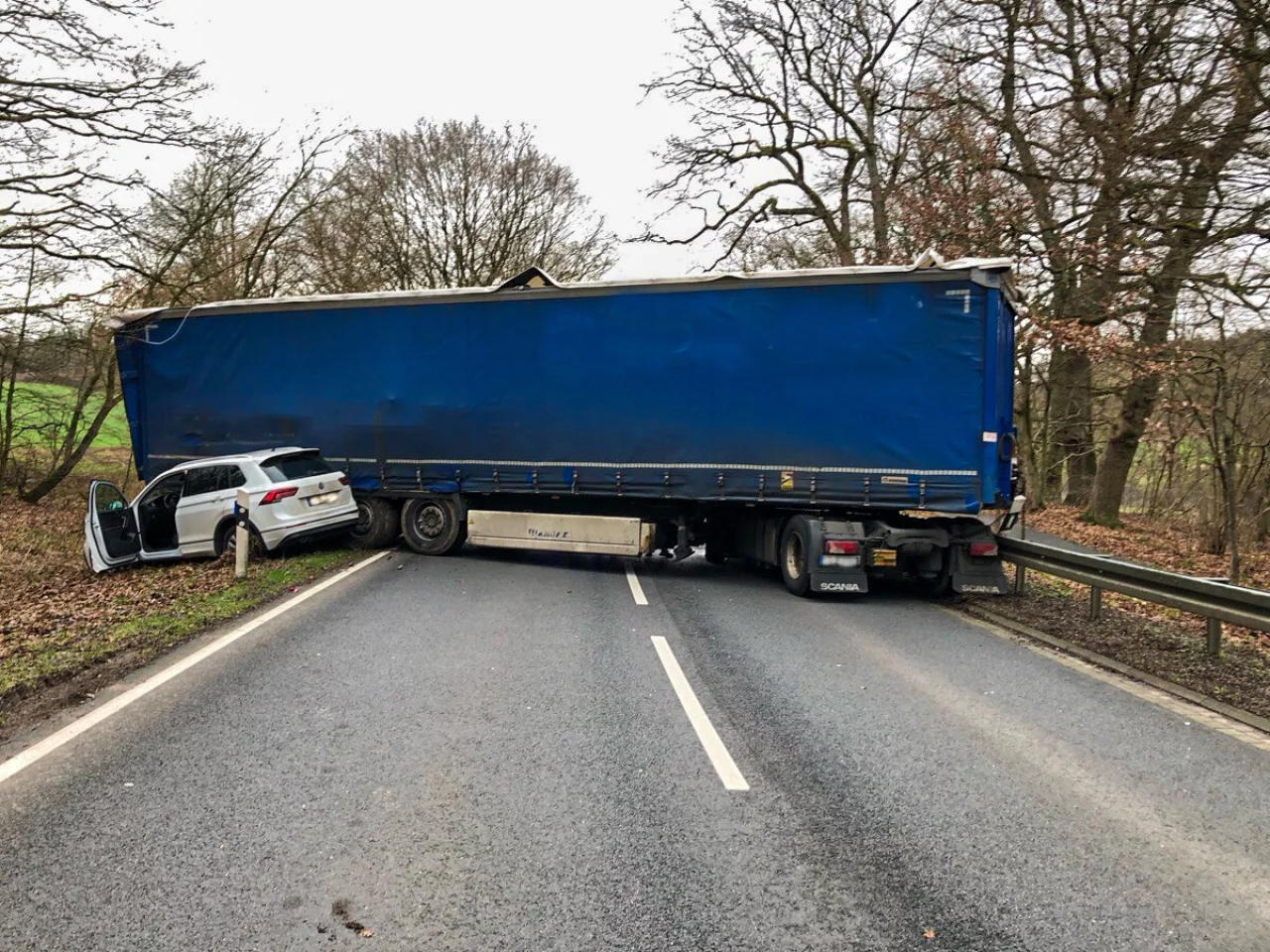 "Anschließend stellte sich das Fahrzeug quer, so dass die Bundesstraße komplett blockiert wurde. Der 33-jährige Fahrer eines VWs aus Barntrup konnte dann nicht mehr rechtzeitig bremsen und prallte auf seiner Fahrt nach Blomberg in den Sattelauflieger. Umherfliegende Fahrzeugteile beschädigten darüber hinaus einen weiteren VW einer 50-jährigen Barntruperin", schildert die Polizei den Unfallhergang. Der 33-jährige Mann sei verletzt worden, der Rettungswagen habe ihn in eine Klinik gefahren.