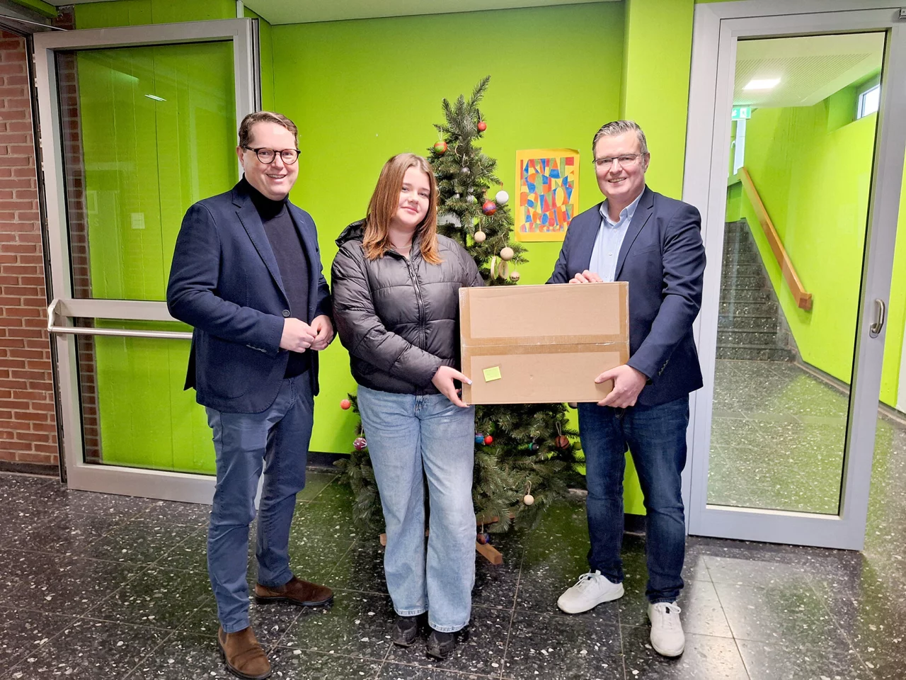 Der Preis wurde Mila Hauser in ihrer Schule von Marc Thiel, Geschäftsführer der Lippe Bildung eG, und Thomas Mahlmann vom zdi-Zentrum Lippe.MINT überreicht. „Ich beglückwünsche Mila zum Gewinn und hoffe, dass derDrucker zu Hause oft zum Einsatz kommt. Toll, dass die Schülerinnen und Schüler so engagiert am Quiz teilnehmen“, sagte Thomas Mahlmann. Schon 2019 habe er das Vergnügen gehabt, an dieser Schule einen Preis an einen Schüler übergeben zu dürfen. „Wir nutzen das Quiz am Lippe.MINT-Tag, um Schülerinnen und Schüler an die Stände der Unternehmen zu führen. Die Fragen sind zum größten Teil so gestaltet, dass sich die Jugendlichen die Antworten bei den Unternehmen abholen müssen“, erklärt Mahlmann.