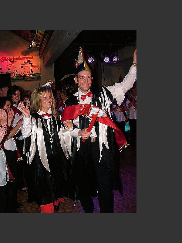 Meerjungfrauen im Schlepptau mit ihrem Meeresgott, der Mann vom Mars, hübsche Teufelinnen oder Piraten der Karibik, in Sachen Verkleidung hatten die Narren und Närrinnen wieder alle Register gezogen. Die tolle Kostümvielfalt sollte sich kurz vor Mitternacht für einen Jecken oder ein komplettes Ensemble noch lohnen, dann stand die Prämierung des besten Kostüms auf dem Programm. Gemeinsam mit dem Storchenrat und in Begleitung der Storchengarde begrüßte pünktlich um 19.30 Uhr das neue Storchenpaar Julia I. Baier und Martin I. Lööck huldvoll das närrische Publikum und dann ging die Party richtig los. Unter dem Jubel der begeisterten Gäste startete ein Aufmarsch aller 20 Storchenpaare seit Bestehen des Storchenkarnevals und Confronciere Jürgen Petersmeier hatte seine Hausaufgaben bestens gemacht.