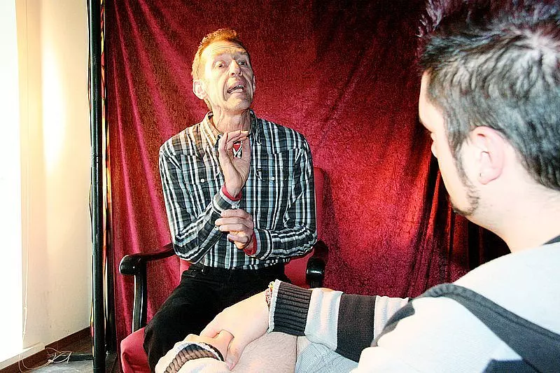 Morgens, 10 Uhr in Blomberg: Wo sonst in der ehemaligen Apotheke am Kurzen Steinweg gähnende Leere herrscht, bilden Tücher neue Wände. Ein gelbes Sofa, Stühle und Kaffeetassen stehen bereit. Thomas Behrend vom Bielefelder Theaterlabor packt noch Knabberzeug auf Teller, während sein Kollege Michael Grunert ruhelos hin und her geht. Lampenfieber? "Habe ich immer, das gehört dazu", sagt der Mann mit dem beredten Gesicht. Er wird heute den Anfang machen.