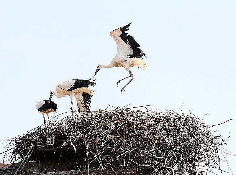 "Vier sind im Baumnest im Pfarrgarten", erklärt Dr. Horst Hollensteiner. "Die fliegen schon hoch in die Luft und über die Felder." Die Jungen im Nest bei Familie Kaminski sind drei Wochen später geschlüpft. "Die müssen das Fliegen noch lernen", so der Veterinärmediziner, der 1989 an der Einbürgerung der Störche maßgeblich beteiligt war.