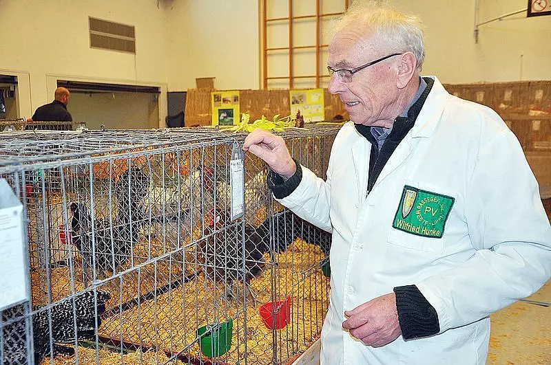Neben der Schönheit des Tieres werden die Form des Schnabels und das Gefieder sowie der Stand bewertet. Wilfried Hunke ist einer der fünf Preisrichter, die die Punktzahlen vergeben. "Ich bin seit 20 Jahren Preisrichter", so Hunke. Der Gütersloher Pensionär musste eine dreijährige Ausbildung absolvieren, um das Amt des Preisrichters ausüben zu können. "Rassekenntnisse und die Liebe zu den Tieren sind hierbei unumgänglich", so Wilfried Hunke, der selber bereits seit einem halben Jahrhundert züchtet. Pro Preisrichter werden 80 Nummern bewertet. Insgesamt stellte der RGZV 329 Tiere aus.